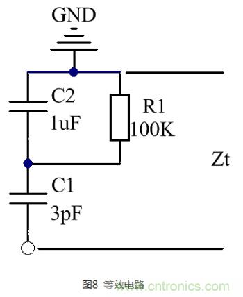 不管正向還是反向接入法,其等效電路都如圖8所示。我們假設(shè)二極管的節(jié)電容為3pF,附件功能模塊寄生總電容1uF。如果電阻足夠大,那么可以忽略,此時(shí)就是兩個(gè)電容串聯(lián),和電阻并聯(lián)類(lèi)似,CT=C1*C2/(C1+C2)≈C1(C2較大)。大電容就算變化很大,串聯(lián)總電容幾乎等于小電容,即3pF,有效減小接入電容。