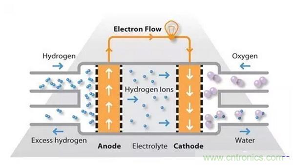 氫燃料在陽(yáng)極處被處理,其中電子與鉑基催化劑的表面上的質(zhì)子分離。質(zhì)子通過(guò)膜到達(dá)電池的陰極側(cè),同時(shí)電子在外部電路中行進(jìn),產(chǎn)生電池的電輸出。在陰極側(cè),另一個(gè)貴金屬電極將質(zhì)子和電子與氧氣結(jié)合以產(chǎn)生水,其作為唯一的廢物排出;氧可以以純化形式提供,或者在電極處直接從空氣中提取。