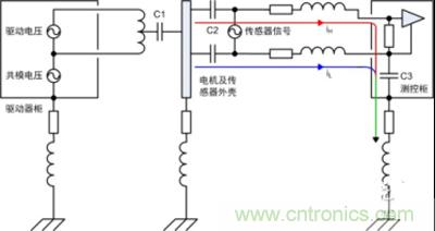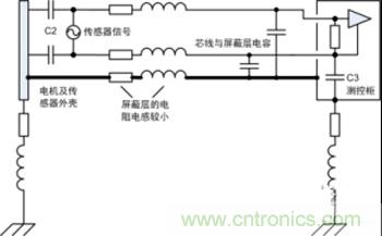 4)此處電機(jī)平臺和測控柜已有接地,通過傳感器連接線屏蔽層又將兩者連接,形成地環(huán)路。然而實(shí)際工程應(yīng)用中地環(huán)路往往不可避免地存在,本例中若沒有屏蔽層依然會通過C2、電纜和C3產(chǎn)生高頻地環(huán)路,從這方面看屏蔽層改變了環(huán)路路徑。