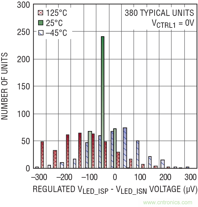圖 1:VCTRL = 0V 時(shí),LT3744 中的 LED 電流調(diào)節(jié)放大器之典型失調(diào)電壓為 ±300µV