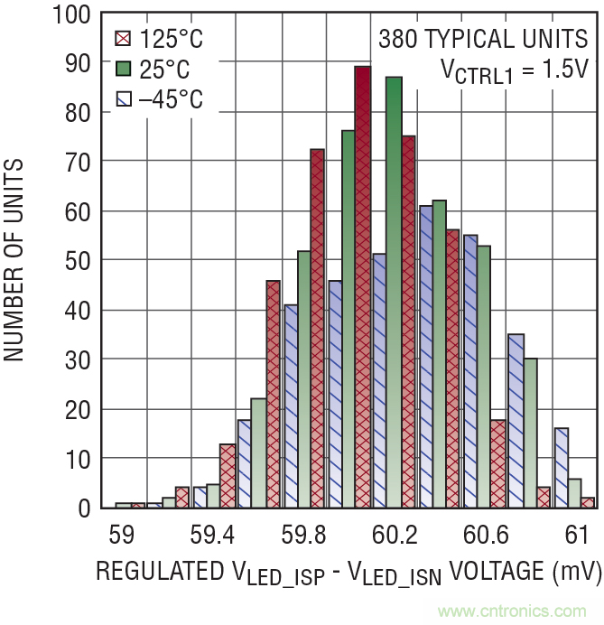圖 1 顯示了當(dāng)模擬控制輸入為 0V 時(shí),隨溫度變化 LT3744 失調(diào)電壓的生產(chǎn)一致性,在這里,典型器件數(shù)量為 380 個(gè)。憑借誤差放大器的低失調(diào),控制環(huán)路在 1/20 標(biāo)度模擬調(diào)光時(shí),能夠?qū)崿F(xiàn) ±10% 的典型準(zhǔn)確度。圖 2 顯示了當(dāng)控制輸入等于 1.5V 時(shí),穩(wěn)定電壓在多個(gè) LED 電流檢測引腳上的分布。滿標(biāo)度范圍的準(zhǔn)確度好于 ±3%,這相當(dāng)于在 60mV 滿標(biāo)度調(diào)節(jié)電壓時(shí)準(zhǔn)確度為 ±1.8mV。
