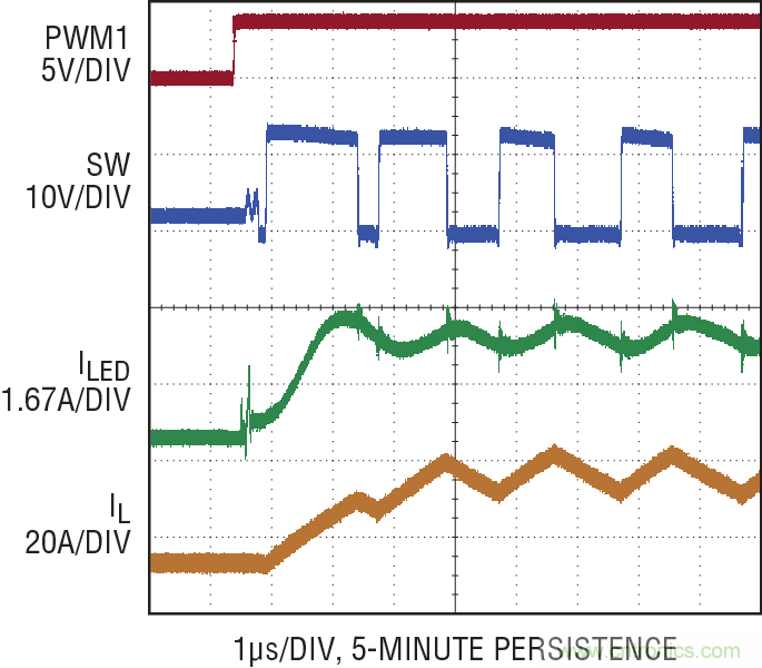 衡量 LED 驅(qū)動(dòng)器性能的最重要指標(biāo)之一是 LED 電流在 PWM 調(diào)光時(shí)的恢復(fù)速度。在 PWM 接通信號上升沿之后的頭幾個(gè)開關(guān)周期中,驅(qū)動(dòng)器的表現(xiàn)對最終產(chǎn)品的質(zhì)量有很大影響。LT3744 采用專有 PWM、補(bǔ)償和時(shí)鐘同步技術(shù),提供無閃爍性能,甚至在驅(qū)動(dòng) LED 至 20A 電流時(shí)也是如此。
