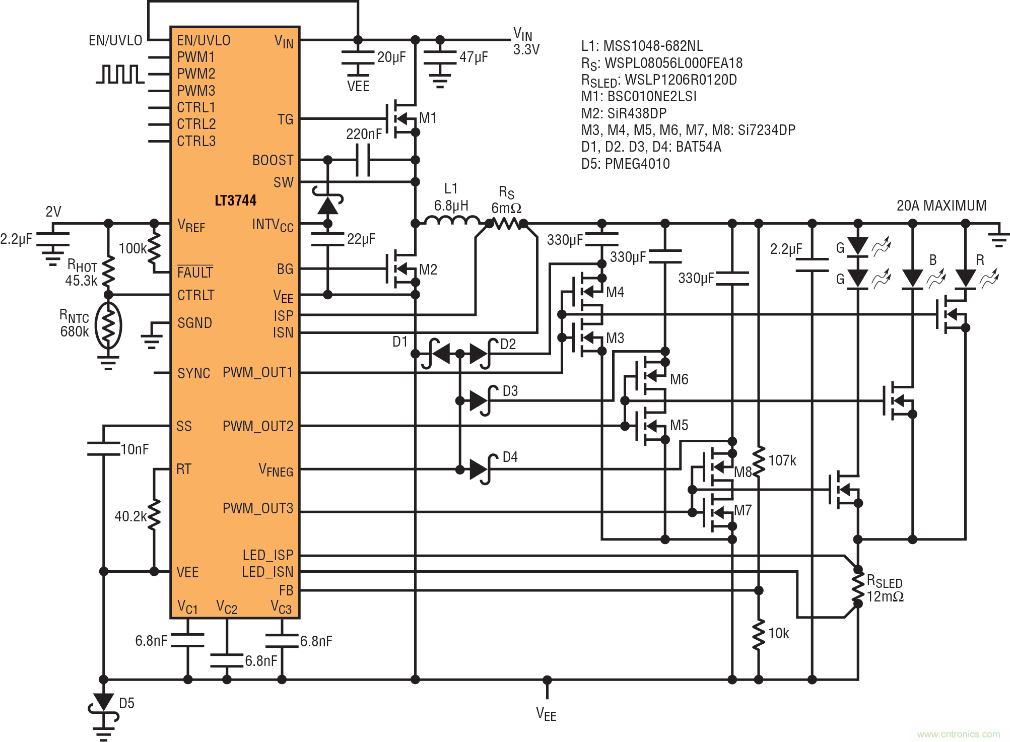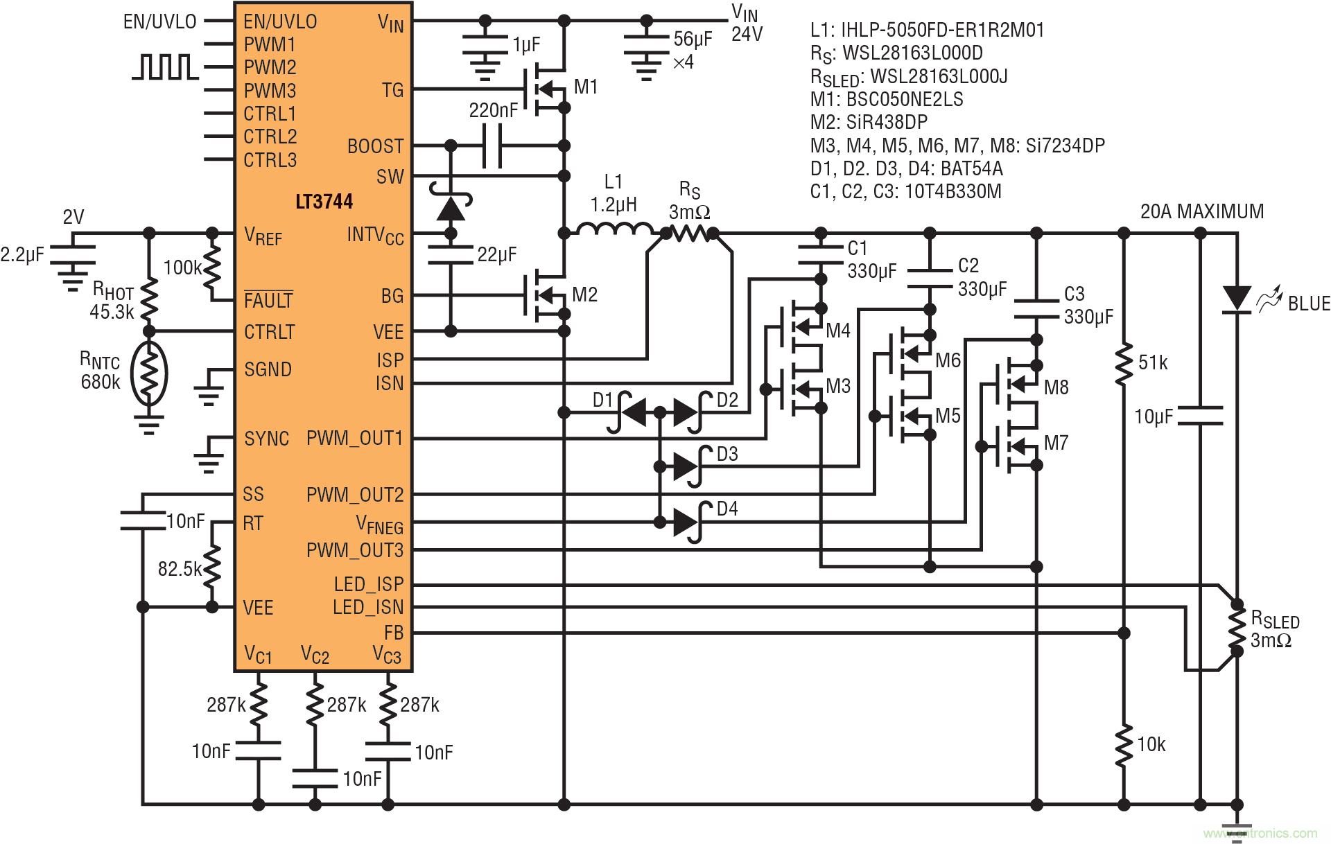 兩個(gè) LT3744 LED 驅(qū)動(dòng)器并聯(lián)以組成 324W 雙 LED 驅(qū)動(dòng)器