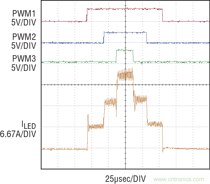 3 種不同電流狀態(tài)之間的 PWM 調(diào)光如圖 5 和圖 6 所示。在圖 5 中,PWM 信號順序接通和斷開。PWM3 的優(yōu)先級最高,PWM1 則最低。這允許單一輸入信號快速轉(zhuǎn)換,以改變輸出電流。如圖 6 所示,PWM 輸入信號之間可以有任意長短的時(shí)間間隔。