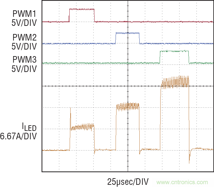 圖 5:LT3744 在 3 種穩(wěn)定電流狀態(tài)之間轉(zhuǎn)換,斷開時(shí)間不到 3 個(gè)開關(guān)周期。