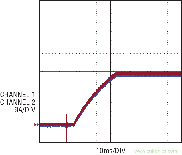 圖 8 顯示了一款 324W 轉(zhuǎn)換器,由兩個(gè)ADI DC2339A 演示電路板并聯(lián)組成。在這款設(shè)計(jì)中,每個(gè)并聯(lián)的控制器都產(chǎn)生 27A 電流,總共產(chǎn)生 54A 電流,電壓為 6V。通過將相應(yīng)的補(bǔ)償輸出連接到一起,兩個(gè)控制器協(xié)調(diào)一致地運(yùn)行,以提供平滑、良好的啟動(dòng)和準(zhǔn)確的 DC 調(diào)節(jié)。