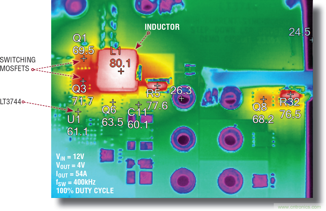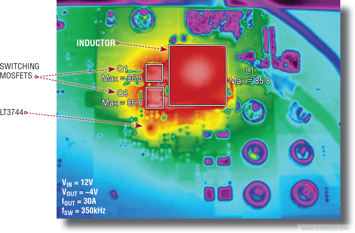 圖 15 顯示,向并聯(lián)負(fù)輸出降壓-升壓型應(yīng)用中的 LED 提供 30A 電流時(shí),組件溫度的上升情況。