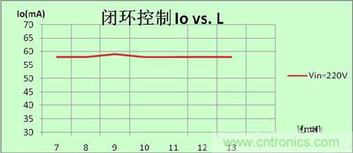 圖4可見,線性調整率為0,因為全閉環(huán)控制逐周期精確控制,輸入有任何變化,芯片會馬上檢測到并作相關的調整以便得到同樣的輸出;同理,如圖5及圖6,當輸出電壓變化,電感量變化時,芯片也會作相關的調整;正是因為我們的全閉環(huán)高精度恒流控制方法,使電源做到了真正的恒流。這樣,量產的一致性可以控制到小于±1%.