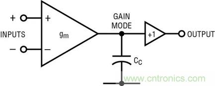圖 1a 顯示了一個(gè)非軌至軌放大器的方框圖。輸入控制 gm 方框,gm 方框驅(qū)動(dòng)增益節(jié)點(diǎn),并在輸出端得到緩沖。補(bǔ)償電容器 Cc 是主要的頻率響應(yīng)組件。Cc 的返回引腳應(yīng)該接地,如果有這樣一個(gè)引腳的話;但是運(yùn)算放大器傳統(tǒng)上不接地,電容器電流會(huì)返回一個(gè)或兩個(gè)電源。圖 1b 是最簡單的軌至軌輸出放大器的方框圖。輸入方框 gm 的輸出電流通過“電流耦合器”發(fā)送,這將驅(qū)動(dòng)電流分成兩部分,提供給輸出晶體管。頻率響應(yīng)由兩個(gè) Cc/2s 決定,二者實(shí)際上是并聯(lián)的。