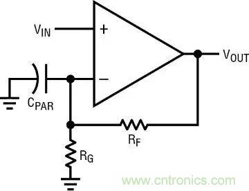 談到振蕩,反饋網(wǎng)絡(luò)本身可也能引起振蕩。請注意,在圖 4 中,我們放上了一個(gè)與反饋分壓器并聯(lián)的寄生電容。這是不可避免的,電路板上每個(gè)組件的每個(gè)端子到地都有約 0.5pF 寄生電容,還有走線的寄生電容。