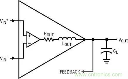 此外,任何放大器都有 20nH 至 70nH 的電生電感,尤其是雙極型器件。器件的有限 Ft 將輸出晶體管的寄生基極電阻變成電感。危害是,Lout 與 CL 可能相互作用,形成一個(gè)串聯(lián)諧振電路,那么同樣的問題又來了,如果環(huán)路中沒有更大的相位滯后,串聯(lián)諧振電路的阻抗就可能降至 Rout 無法驅(qū)動(dòng)的水平,從而可能產(chǎn)生振蕩。例如,設(shè)定 Lout = 60nH 和 CL = 50pF。諧振頻率