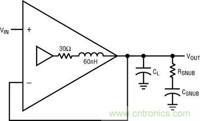 防止負(fù)載電容引起振蕩的最常見方式是,在反饋連接之后,簡單地給電容串聯(lián)一個(gè)小阻值的電阻器。10Ω 至 50Ω 的阻值將限制容性負(fù)載可能引起的相位滯后,并在速度非常高的時(shí)候,隔離放大器和低容性阻抗。缺點(diǎn)包括隨負(fù)載電阻特性而變化的 DC 和低頻誤差、容性負(fù)載頻率響應(yīng)受到限制、以及如果負(fù)載電容在電壓變化時(shí)不恒定所導(dǎo)致的信號(hào)失真。