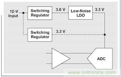 極大降低系統(tǒng)功耗的一種方法是對高速數(shù)據(jù)轉(zhuǎn)換器的電源進(jìn)行優(yōu)化。數(shù)據(jù)轉(zhuǎn)換器 設(shè)計和工藝技術(shù)的一些最新進(jìn)展,讓許多新型 ADC 可以直接由開關(guān)電源來驅(qū) 動,從而達(dá)到最大化功效的目的。 系統(tǒng)設(shè)計人員們習(xí)慣在開關(guān)穩(wěn)壓器和 ADC 之間使用一些低噪、低壓降穩(wěn)壓器 (LDO),以清除輸出噪聲和開關(guān)頻率諧波(請參見圖 1)。但是,這種干凈的電 源設(shè)計的代價是高功耗,因為 LDO 要求壓降余量來維持正常的運行。最低壓降 一般為 200 到 500mV,但在一些系統(tǒng)中其可以高達(dá) 1 到 2V(例如,ADC 的3.3-V 電壓軌產(chǎn)生自一個使用 LDO 的 5V 開關(guān)電源時)。