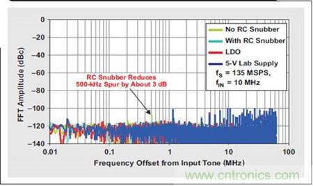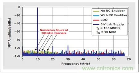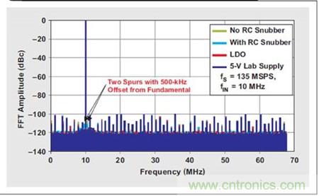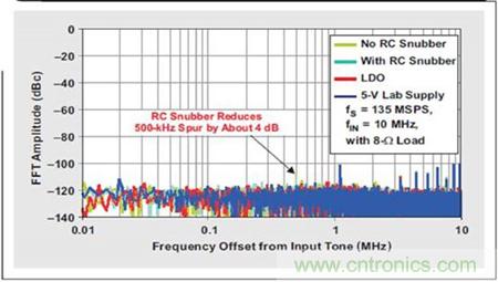 5 個實驗的 FFT 曲線圖對比(請參見圖 6)顯示噪聲底限或雜散振幅沒有出現(xiàn) 較大的增加。使用 LDO 清除開關(guān)噪聲使得輸出頻譜看起來幾乎與干凈 5-V 實 驗室電源完全一樣。去除 LDO 以后,我們觀測到從開關(guān)穩(wěn)壓器產(chǎn)生了兩個雜散, 其具有一個來自 10-MHz 輸入音調(diào)的約 500 kHz 頻率偏置。RC 緩沖器電路降 低這些雜散振幅 約 3dB,從約 –108 dBc 降到了約 –111 dBc。這一值低于 ADS5483 的平均雜散振幅,其表明 ADS5483 可以在不犧牲 SNR 或 SFDR 性 能的情況下直接由一個開關(guān)穩(wěn)壓器來驅(qū)動。