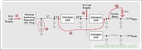 實驗 6—將一個 5-V 實驗室電源連接到兩個低噪聲 LDO(一個使用 3.3-V 輸 出,另一個使用 1.8-V 輸出)的輸入。LDO 并未給實驗室電源帶來任何有影響 的噪聲。實驗 7—將一個 10-V 實驗室電源連 接到 TPS5420 降壓穩(wěn)壓器,其與 一個5.3-V 輸出連接,像“實驗 2”連接 ADS5483 一樣。TPS79501 生成了一個過濾后的 5.0-V 電壓軌,其向 3.3-V 輸出和 1.8-V 輸出 LDO 提供輸入,如圖 10所示。 實驗 8—所有 3.3-VVDDA 電壓軌 LDO 均被繞過。TPS5420 配置為一個 3.3-V 輸出,該輸出直接連接到 3.3-VVDDA 電壓軌。TPS79601 生成 1.8-VDVDD 電壓軌, 并通過一個外部 5-V 實驗室電源供電。