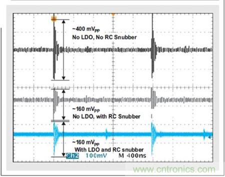 圖 11 顯示了“實驗 7”、“實驗 8”和“實驗 9”產(chǎn)生的一些 3.3-VVDDA 輸出波 形。有或無 LDO 的峰值電壓振幅存在一些差異,但 RC 緩沖器可降低 60% 的 峰值噪聲。