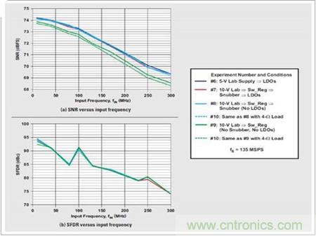 5 次實驗的結(jié)構(gòu)變化配置如下: 實驗 1—一個 5-V 實驗室電源直接連接到 5-V 模擬輸入,同時繞過開關(guān)穩(wěn)壓器(TPS5420) 和低噪聲 LDO (TPS79501)。使用一個板上 LDO(TI 的 TPS79633)生成 ADS5483 低敏感度 3.3-V 模擬及數(shù)字電源的 3.3-V 電壓軌。