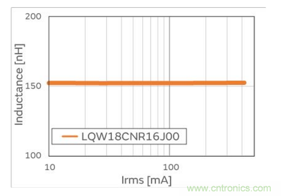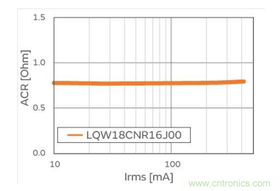 由于電感器的電流值發(fā)生變化,電感值也會(huì)發(fā)生變化。如圖2所示,LQW18CN系列對(duì)于AC電流的電感值依存性非常小。因此,即使NFC電路流通的AC電流變大,特性也不會(huì)發(fā)生很大變化。此外,如圖3 所示,即使是大電流也能保持低ACR。