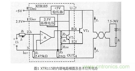 XTR115采用SO-8小型化封裝,其內(nèi)部電路框圖及基本應(yīng)用電路如圖1所示。U+為電源端,接環(huán)路電源。UREF為2.5V基準(zhǔn)電壓輸出端。II端接輸入電流。IRET為基準(zhǔn)電壓源輸出電流和穩(wěn)壓器輸出電流的返回端,可作為輸入電路的公共地。OUT為4~20mA電流輸出端。UREG為+5V穩(wěn)壓器的輸出端。B和E端為外部功率管的接口,分別接功率管的基極(B)和發(fā)射極(E)。功率管的集電極(C)接U+端。芯片內(nèi)部主要包括輸入放大器(A),電阻網(wǎng)絡(luò),輸出晶體管(VT1),2.5V基準(zhǔn)電壓源和+5V穩(wěn)壓器。RLIM為內(nèi)部限流電阻。外圍元器件主要有輸入電阻(RI),功率管(VT2),環(huán)路電源(Us)和負(fù)載電阻(RL)。輸入電壓UI先經(jīng)過(guò)RI轉(zhuǎn)換成輸入電流II,再經(jīng)過(guò)XTR115放大后從OUT端輸出4~20mA的電流信號(hào)。為減小失調(diào)電壓以及輸入放大器的漂移量,要求UI》0.5V