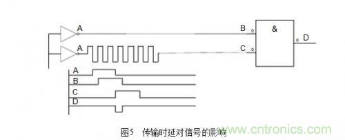 (3)保證信號(hào)在PCB上可靠的傳輸,確保信號(hào)的完整性。這里面主要的問題一般包括時(shí)延、阻抗不匹配、地彈跳、串音等。這不但影響到電子器件的穩(wěn)定工作,還會(huì)產(chǎn)生電磁干擾。一般在高速邏輯設(shè)計(jì)中最容易碰到時(shí)延問題,處理不好會(huì)產(chǎn)生不希望的脈沖干擾。傳輸時(shí)延對(duì)信號(hào)的影響如圖5所示。