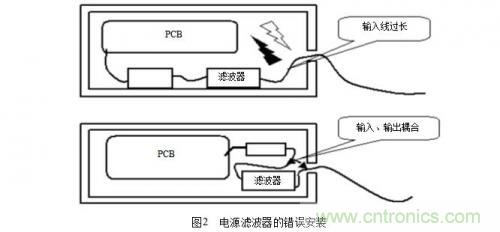 (3)在電源電路(尤其是開關(guān)電源中),操縱電路,控制電路,以及轉(zhuǎn)換電路中消除產(chǎn)生的干擾。在工程實(shí)際中,一個(gè)最值得注意的地方是電源濾波器的安裝,常見的濾波器的錯(cuò)誤安裝如圖2所示。
