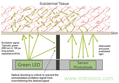 圖2中所示的短至10µs的窄光脈沖支持系統(tǒng)去容忍運動和陽光,典型的方法是每秒25次采樣率下的每次次的快速光測試,一次測量是在LED關閉的情況下完成的,而另一次則是在LED打開的情況下完成。計算得出的差值消除了環(huán)境光的影響,重要的是給出了對閃爍的背景光不敏感的期望的原始光信號測量值。