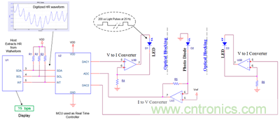 如圖2所示,在一個光電心率系統(tǒng)設計中,難以實現和成本很高的功能模塊分別是:快速的、大電流的驅動LED的電壓到電流轉換器,用于光電管的電流到電壓轉換器,以及運行算法和對序列信號進行處理的MCU。一個可被設置到低至2mA的很低電流,但同時仍然能產生短至10µs的非常窄的光脈沖低噪聲(75 - 100 dB SNR)300mA LED驅動器也是一個用分離器件實現起來非常昂貴的模塊。