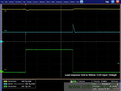 a) 由于有限的控制回路速度,負(fù)載電流的快速變化會(huì)導(dǎo)致輸出電壓的變化。有時(shí)內(nèi)部調(diào)節(jié)回路無法對(duì)電流的快速變化(由于時(shí)間延遲)作出反應(yīng),就會(huì)導(dǎo)致通常約為幾十毫伏(mV)的下沖/過沖。