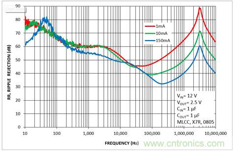 b)輸入電壓的快速變化(通常是由DC-DC轉(zhuǎn)換器的輸出電壓紋波引起的)無法通過控制回路完全過濾,于是輸入電壓的變化會(huì)一定程度地反映在輸出電壓中,該參數(shù)稱為電源抑制比(PSRR),且通常是頻變參數(shù)。一些制造商標(biāo)示的PSRR為負(fù)數(shù),有些則為正數(shù)。一般而言,PSRR絕對(duì)值越高,從輸入到輸出的傳輸干擾信號(hào)就越少。通常情況下,受到干擾的輸入電壓會(huì)以mV或更低的單位級(jí)別傳輸至輸出端。相似地,輸入電壓的快速變化(即“線路瞬態(tài)響應(yīng)”)可發(fā)生于LDO輸出端。