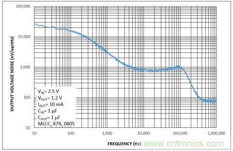 c)半導(dǎo)體結(jié)構(gòu)自身會(huì)產(chǎn)生固有的噪聲,主要是由自由原子與基礎(chǔ)材料晶體結(jié)構(gòu)碰撞而引起。由于固有噪聲是一種半導(dǎo)體中與電流傳導(dǎo)原理相關(guān)的物理現(xiàn)象,因此可以通過一些技術(shù)來抑制,但是不可能將其徹底去除?,F(xiàn)代LDO的輸出噪聲可以達(dá)到數(shù)以百計(jì)的微伏(uV)甚至更小,但是頂級(jí)LDO產(chǎn)生的噪聲就會(huì)達(dá)到微伏(uV)單位。