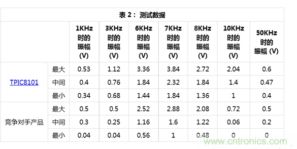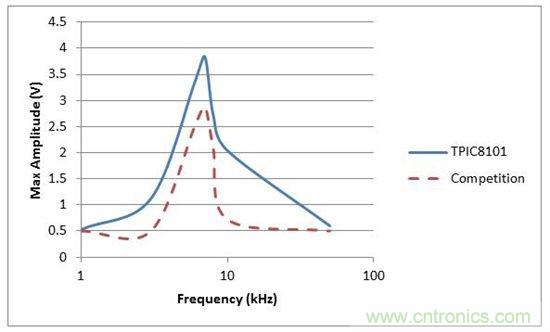 圖 2 顯示了表 1 中的結(jié)果。 噪聲等級 () 在兩個器件之間大概是相同的,因?yàn)檫h(yuǎn)離中心頻率的振幅基本相同。 在中心頻率,TPIC8101 具有更高的振幅,這意味著其 SNR 要優(yōu)于競爭產(chǎn)品。