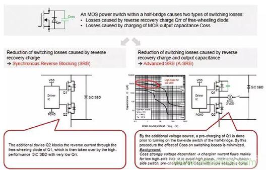 同步反向阻斷(SRB)串聯(lián)第二開關(guān)晶體管Q2以阻斷開關(guān)晶體管Q1的續(xù)流二極管中的反向電流。Q2的激活與Q1同步。反向電流通過并聯(lián)的碳化硅(SiC)肖特基二極管,該二極管具有高擊穿電壓和極低的反向恢復(fù)電荷,這大大降低了Qrr對開關(guān)損耗的影響。Q2的續(xù)流二極管的極性確保晶體管不能產(chǎn)生高電壓,因此,低介電強度(60 V)的型款就足夠了。