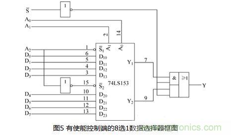 也可以添加使能控制端對所接成的8選1數(shù)據(jù)選擇器的工作狀態(tài)進行控制。添加使能控制端的8選1數(shù)據(jù)選擇器的電路如圖5所示。