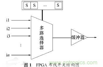 在FPGA各種資源中,可編程邏輯塊是實現(xiàn)用戶功能的基本單元,每個可編程邏輯塊包含1個互連開關(guān)矩陣和4個SLICEs,其中每個SLICE包括2個查找表(Look-Up-Table,LUT)、2個觸發(fā)器和一些多路選擇器。互連開關(guān)矩陣主要由不同長度導(dǎo)線和多個布線開關(guān)組成,典型的布線開關(guān)結(jié)構(gòu)如圖1所示。