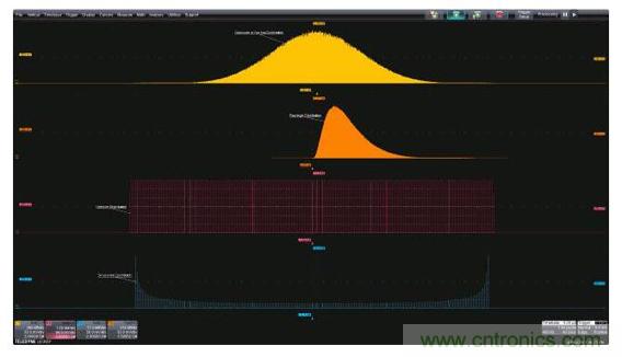 在許多應(yīng)用中,兩個(gè)或多個(gè)隨機(jī)過(guò)程可能發(fā)生交互。當(dāng)這種情況發(fā)生時(shí),過(guò)程的概率密度會(huì)進(jìn)行數(shù)學(xué)卷積運(yùn)算。一個(gè)常見(jiàn)的例子是結(jié)合了隨機(jī)和確定性抖動(dòng)分量的時(shí)序抖動(dòng)。圖5顯示了結(jié)合在一起的高斯和正弦分量,源分布位于上面兩張圖,從上往下數(shù)的第三張分布圖是兩個(gè)源卷積的結(jié)果。許多先進(jìn)的示波器提供可選的抖動(dòng)或噪聲分析包,這些分析包可以將這些組合式分布分開,單獨(dú)測(cè)量分量。