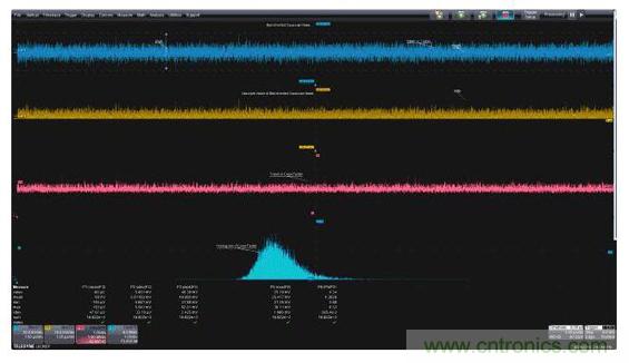 圖1:左上圖是帶寬受限的高斯噪聲的時(shí)域圖,左下圖是功率譜密度,是帶寬受限噪聲的頻域圖;右面的柱狀圖是帶寬受限噪聲的統(tǒng)計(jì)圖。這三個(gè)視圖都因采用了有助于對(duì)測(cè)量進(jìn)行量化的測(cè)量參數(shù)而得到增強(qiáng)。