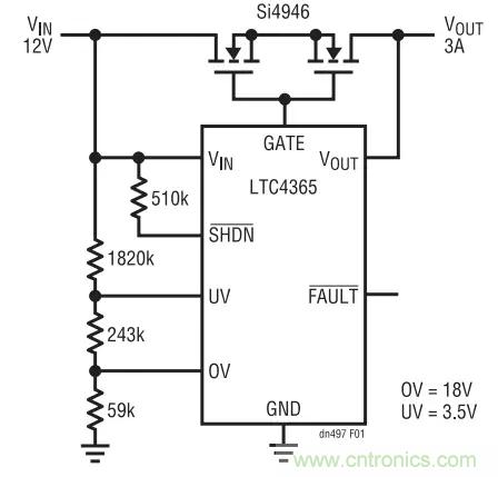 圖 1 示出了一款完整的應(yīng)用電路。一個(gè)阻性分壓器負(fù)責(zé)設(shè)定用于負(fù)載與 VIN 連接 / 斷接的過壓(OV)和欠壓 (UV) 跳變點(diǎn)。如果輸入電源漂移至該電壓窗口之外,則 LTC4365 將迅速把負(fù)載與電源斷接。