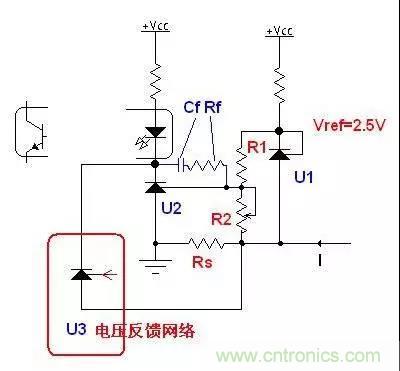 TL431 價格低廉,在開關(guān)電源的反饋環(huán)路大量應(yīng)用,但其FB電壓為2.5V,直接用做電流反饋時要很大的采樣電阻,浪費(fèi)電壓。圖中用兩個TL431實(shí)現(xiàn)電流反饋,可以用比較小的采樣電阻實(shí)現(xiàn)精密的電流反饋,如果還有電壓反饋網(wǎng)絡(luò),再并上U3的電壓反饋電路。