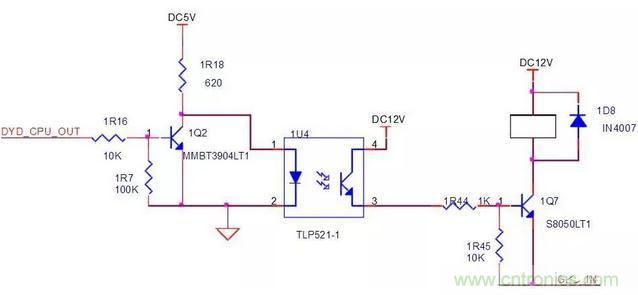 “DYD_CPU_OUT”連接LPC2367,輸出高低電平,低電平,1U4不通,1Q7不通,UCE=12V,1Q7-3=12V,線圈兩端電壓為0V。