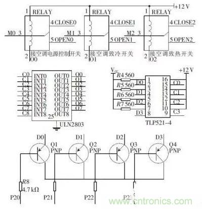 【導(dǎo)讀】繼電器開關(guān)模塊由TLP521 -4 、ULN2803 和SRD -12VDC 及三極管構(gòu)成,由微控制器輸出的信號經(jīng)過三極管構(gòu)成的開關(guān)電路送往TLP521 -4 光耦芯片再通過ULN2803 達(dá)林頓管的放大后用來驅(qū)動SRD-12DC 繼電器,進而達(dá)到控制空調(diào)的各種開關(guān)的作用。