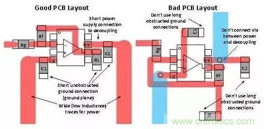 除了使用去耦電容器外,您還要在去耦電容器、電源和接地端之間采取較短的低阻抗連接。圖3將良好的去耦合板面布局與糟糕的布局進(jìn)行了對(duì)比。您應(yīng)始終嘗試著讓去耦合連接保持較短的距離,同時(shí)避免在去耦合路徑中出現(xiàn)通孔,原因是通孔會(huì)增加電感。大部分產(chǎn)品說明書都會(huì)給出去耦合電容器的推薦值。如果沒有給出,則可以使用0.1uF。