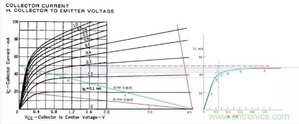 圖中假定電源電壓為4V,綠色的斜線是負(fù)載電阻為80歐姆的負(fù)載線,V/R=50MA,圖中標(biāo)出了Ib分別等于0.1、0.2、0.3、0.4、0.6、1.0mA的工作點(diǎn)A、B、C、D、E、F。據(jù)此在右側(cè)作出了Ic與Ib的關(guān)系曲線。根據(jù)這個(gè)曲線,就比較清楚地看出“飽和”的含義了。曲線的綠色段是線性放大區(qū),Ic隨Ib的增大幾乎成線性地快速上升,可以看出β值約為200。蘭色段開始變彎曲,斜率逐漸變小。紅色段就幾乎變成水平了,這就是“飽和”。實(shí)際上,飽和是一個(gè)漸變的過(guò)程,蘭色段也可以認(rèn)為是初始進(jìn)入飽和的區(qū)段。在實(shí)際工作中,常用Ib*β=V/R作為判斷臨界飽和的條件。在圖中就是假想綠色段繼續(xù)向上延伸,與Ic=50MA的水平線相交,交點(diǎn)對(duì)應(yīng)的Ib值就是臨界飽和的Ib值。圖中可見(jiàn)該值約為0.25mA。