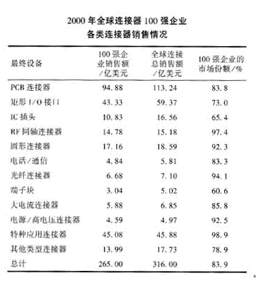 自2001年以來,受“9.11”恐怖事件、網(wǎng)絡通訊業(yè)泡沫破滅及美國經濟低迷的影響,世界連接器市場一度遭受重創(chuàng),2001年的銷售額下降19.1%,但是,軍用連接器市場卻在平穩(wěn)中微增。據(jù)Fleck的研究報告,軍事/航天用連接器2000年的銷售額為20.072億美元,2001年達到20.118億美元,增長0.2%。全球連接器100強企業(yè)占據(jù)了69.1%軍用連接器市場份額,如表1所示。各類軍用連接器也基本上由全球100強企業(yè)所壟斷,如表2所示。