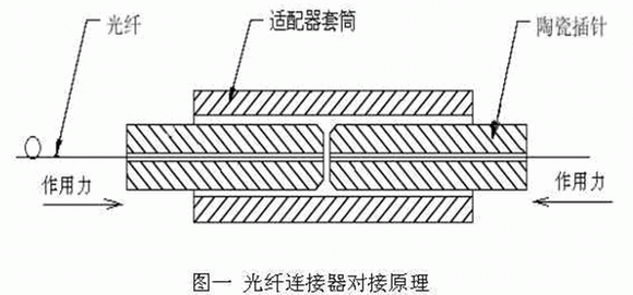 光纖連接器不能單獨(dú)使用,它必須與其它同類型的連接器互配,才能形成光通路的連接,目前,較為流行的光纖連接器裝配和對(duì)接方式為:利用環(huán)氧樹(shù)脂熱固化劑,將光纖粘固在高精度的陶瓷插針孔內(nèi),然后使兩插針在外力的作用下,通過(guò)適配器套筒的定位,實(shí)現(xiàn)光纖之間的對(duì)接(如圖一)。