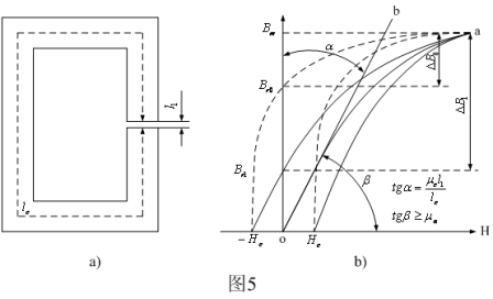 圖5-b) 中,虛線是沒留有氣隙變壓器鐵芯的磁化曲線,實線是留有氣隙變壓器鐵芯的磁化曲線;曲線b是留有氣隙變壓器鐵芯的等效磁化曲線,其等效導(dǎo)磁率,即曲線的斜率為