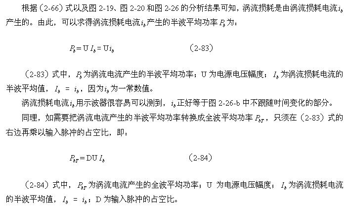 順便指出:(2-84)式的結(jié)果,是認(rèn)為渦流損耗在t1-t2期間(圖2-26-b)完全等于0而求得的,但實(shí)際上,在t1-t2期間變壓器初級線圈產(chǎn)生的反電動(dòng)勢同樣也會(huì)在變壓器鐵芯中感應(yīng)產(chǎn)生渦流損耗電流,即當(dāng)輸入電壓為0時(shí)刻,在變壓器鐵芯中還存在很短暫時(shí)間的渦流損耗;由于這種渦流損耗是由反電動(dòng)勢提供能量來維持的,它將隨著反電動(dòng)勢能量的衰減很快就衰減到0。