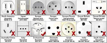 這些插頭/座大多彼此互不兼容,如果再把同一類型中耐壓、功率的差別計(jì)入在內(nèi),種類就更多了。這種情況顯然造成:即使電器設(shè)備供電電壓相同,也無法在不同地區(qū)使用。國(guó)際電工委員會(huì)(IEC)曾經(jīng)在1986年和1992年頒布了電源插頭/座的國(guó)際標(biāo)準(zhǔn):針對(duì)250V電壓等級(jí)的IEC60906-1和針對(duì)125V電壓等級(jí)的IEC60906-2。其3芯插頭外觀(圖2.1)類似于表2.1中的J型,由于與全球范圍內(nèi)大多數(shù)插頭/座不兼容(圖2.2),推行受到很大阻力。