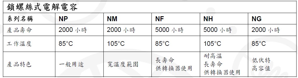 全新推出的工業(yè)級(jí)超長效鎖螺絲式電解電容系列包括NP、NM、NF、NH、NG 等五個(gè)系列,分別鎖定一般用途、寬溫度范圍、長效轉(zhuǎn)換器、高溫環(huán)境轉(zhuǎn)換器以及低電壓大容值等應(yīng)用。工作溫度范圍涵蓋85°C 至105°C;使用壽命時(shí)效,則一舉提升至2000 到5000 小時(shí)。與其他同類型產(chǎn)品相比,具備難以匹敵的寬溫度范圍及長時(shí)效特性。