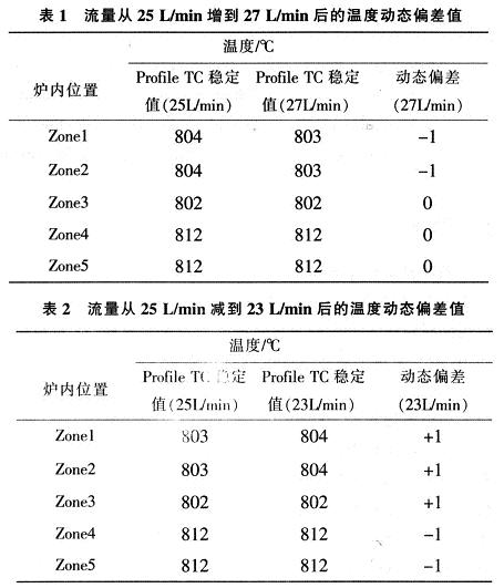 (4)手動(dòng)調(diào)節(jié)大N2流量,從25L/min,減少到23L/min,記錄流量調(diào)節(jié)前后穩(wěn)定溫度值和流量變化導(dǎo)致的溫度動(dòng)態(tài)偏差值,見表2,表中Zone1為爐尾,Zone2是爐中尾,Zone3為爐中,Zone4是爐中口,Zone5為爐口。