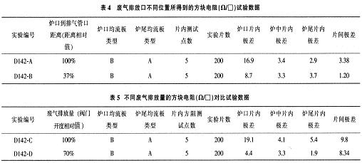 從表4可看出,廢氣排放口離恒溫區(qū)越遠(yuǎn),即離爐口越近,爐口的方阻片內(nèi)/片間均勻性改善越好,但廢氣排放的同時(shí)也有大量熱能的排放,在排放口區(qū)域聚集的熱能較多,因考慮到爐門的低溫(一般為小于200℃)要求,在一定程度上又限制了排放口到爐門的距離不能太近。所以,生產(chǎn)中廢氣排放口的較佳位置是在一個(gè)兩向平衡距離范圍內(nèi)。